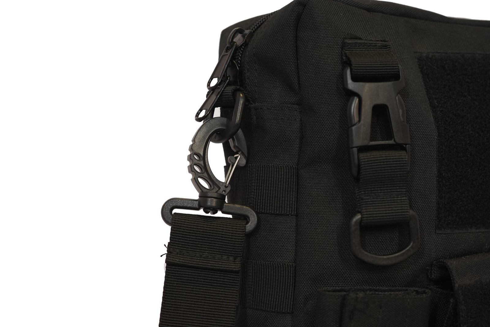 For efficient organization, the bag features multiple compartments to keep essentials neatly arranged. A front quick-access pocket with Velcro closure allows rapid retrieval of frequently used items, while secure zipper closures ensure the safety of stored gear. Side loops and D-rings provide additional attachment points for accessories, tools, or carabiners, enhancing versatility.