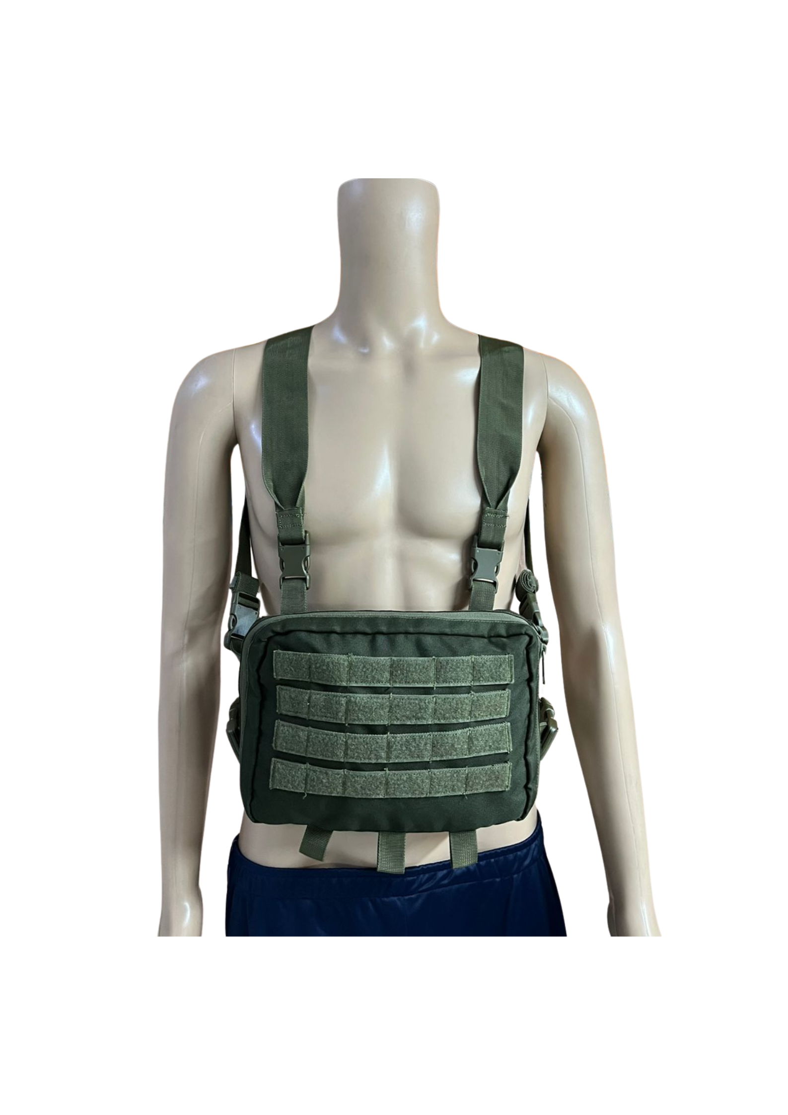 The bag features adjustable neck/shoulder harness and waist belt, allowing a secure fit across different body types and configurations. Quick-release buckles and fast-strap systems enable rapid donning and doffing when operational speed is critical. A ventilated back panel enhances comfort during extended wear, while the ergonomic structure ensures stability during movement.